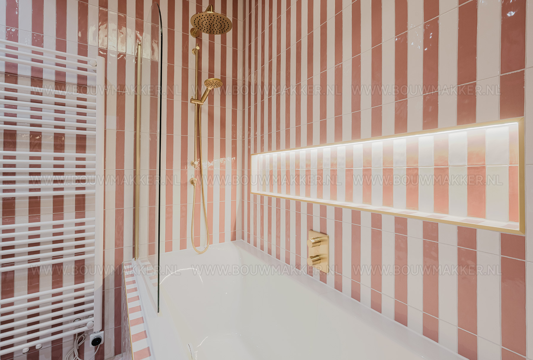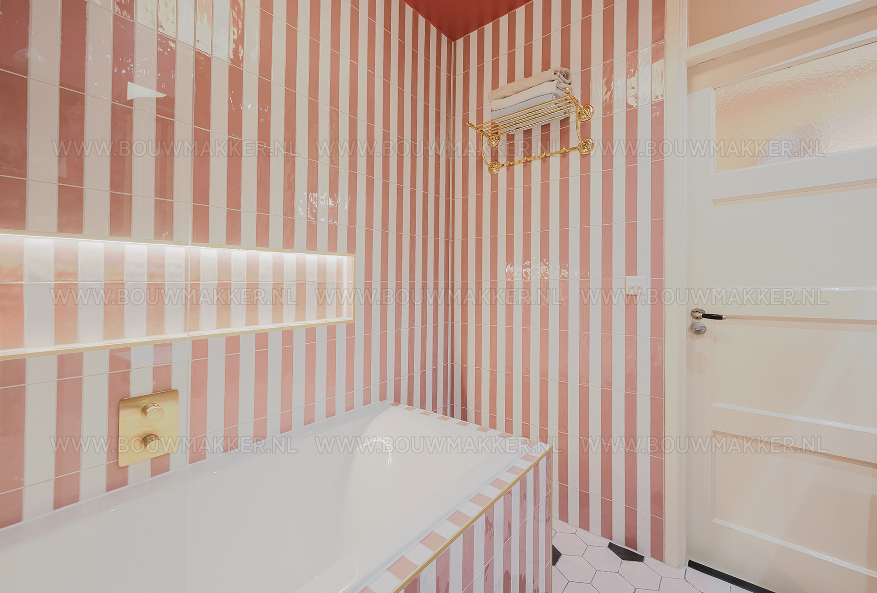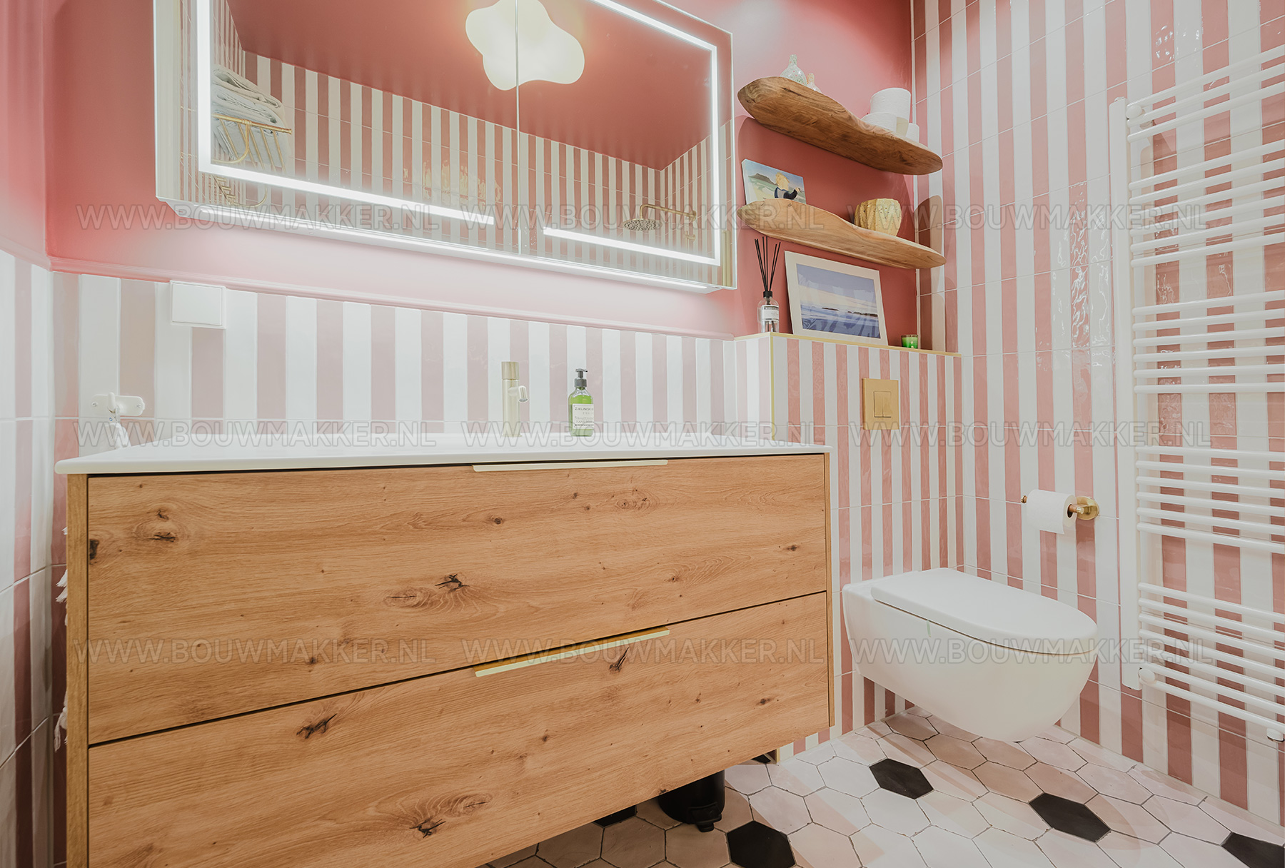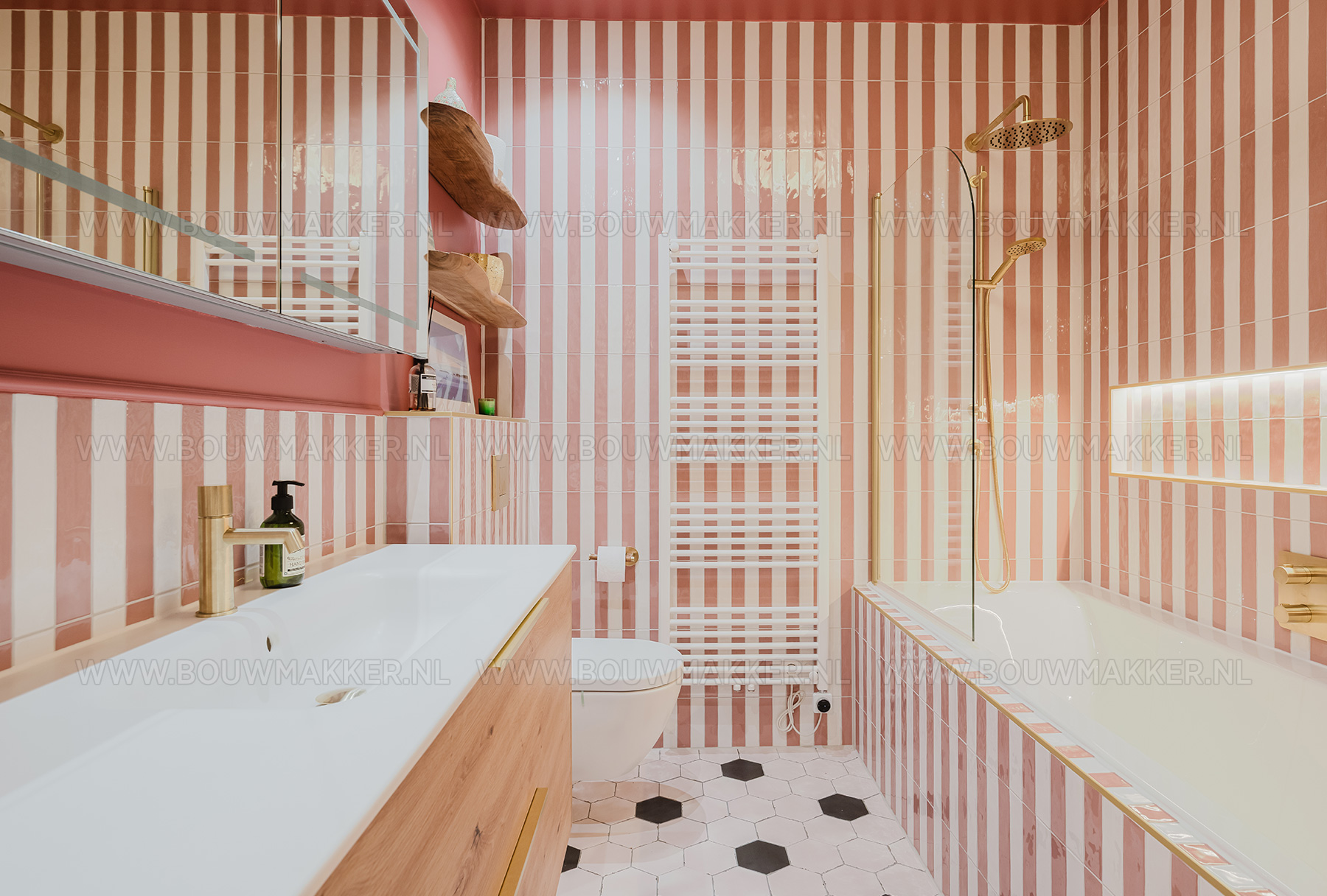 Het resultaat is een prachtige mix van roze en wit geglazuurde tegels, chique details en klassieke vormen die samen een tijdloze balans tussen oud en nieuw uitstralen. De gouden kranen, doorspoelknop en het handdoekenrekje zorgen voor een vleugje glamour, terwijl het zwevende toilet en de glazen douchewand de ruimte licht en modern houden. De inbouwbad-douchecombinatie met regendouche vormt het pronkstuk van deze badkamer. En de zwart-witte hexagonvloer brengt precies dat beetje contrast dat het geheel kracht geeft. Alles klopt in deze ruimte: van de kleurcombinatie tot aan de spiegelkast waarin stijl en functionaliteit elkaar ontmoeten.