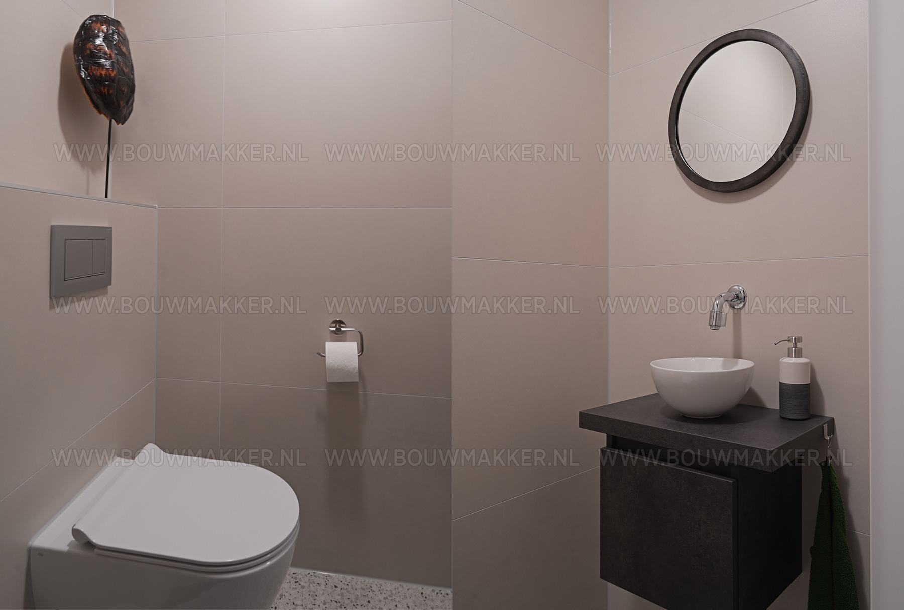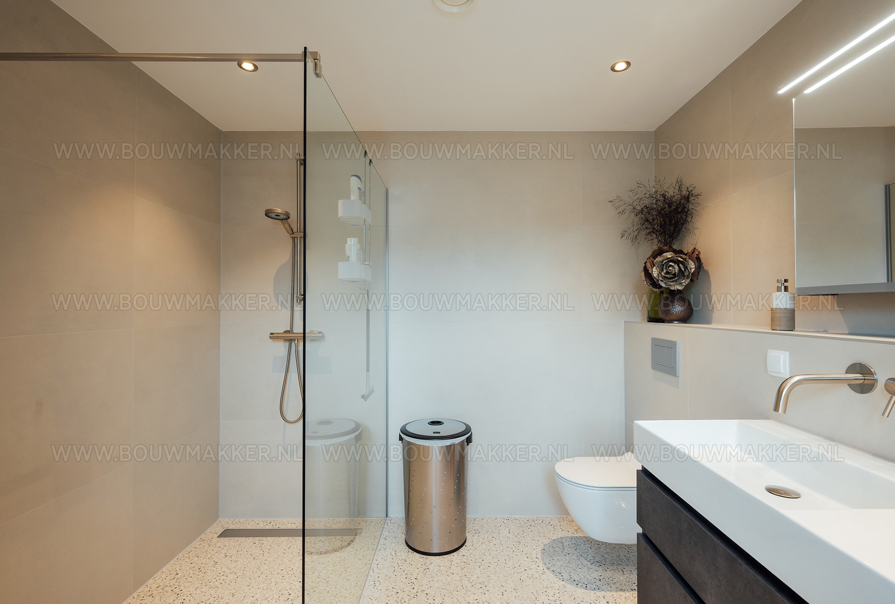 Net als het oude gebouw heeft ook de badkamer bijzondere eigenschappen. De ruimte staat namelijk als een soort kubus in het midden van de woning. Om het contrast met de woning te benadrukken, gingen de bewoners voor een rustig ontwerp. In de badkamer ligt een moderne terrazzo tegelvloer die mooi matcht bij de warmgrijze tegels op de wand. De inloopdouche is ruim opgezet en ook op de dubbele wastafel en het zwevende toilet is niet ingeleverd. Het geheel straalt rust en ruimte uit. Precies wat deze kamer middenin dit unieke pand nodig heeft.