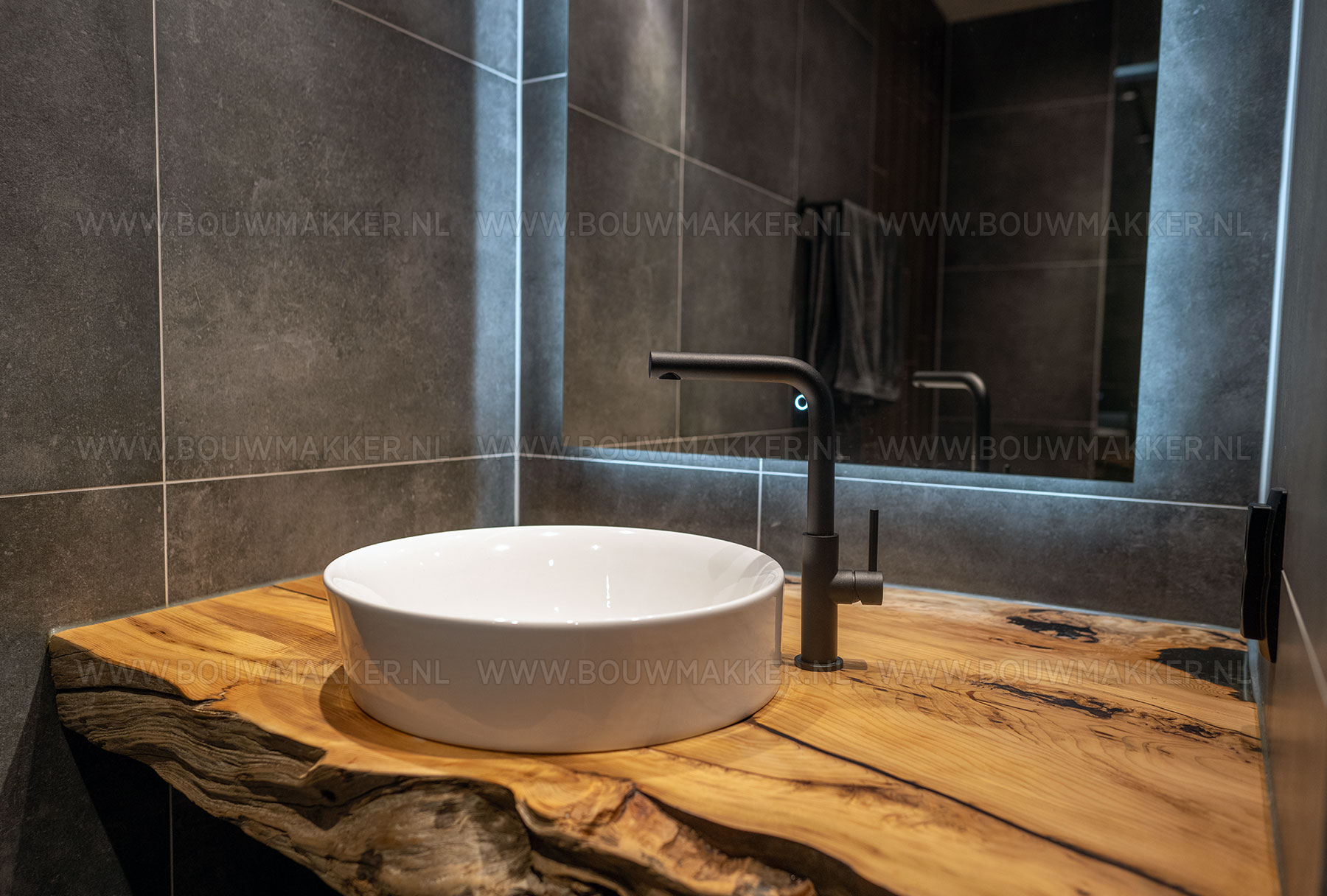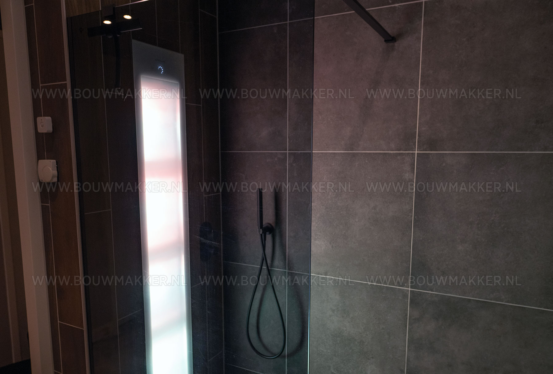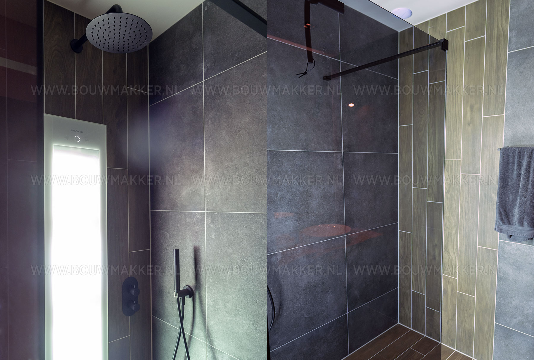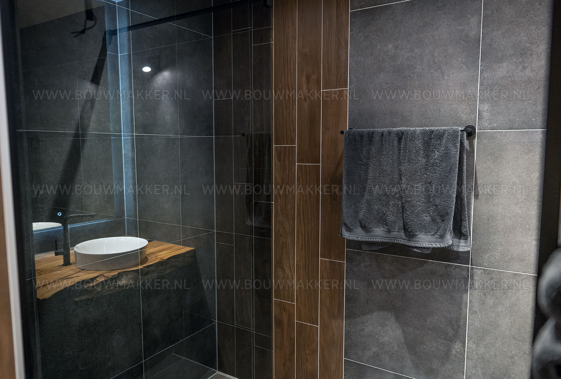 Dat de kleuren van het warme hout en de donkere tegels zo goed op elkaar afgestemd zijn, is natuurlijk geen toeval. Deze bewoner heeft een goede smaak en dat is te zien. Hij had een aantal specifieke wensen zoals een Sunshower, een speaker aan het plafond en mat zwarte inbouwkranen. Zo gevraagd, zo geplaatst! Het geheel is clean en stijlvol geworden, precies wat deze ruimte nodig had.